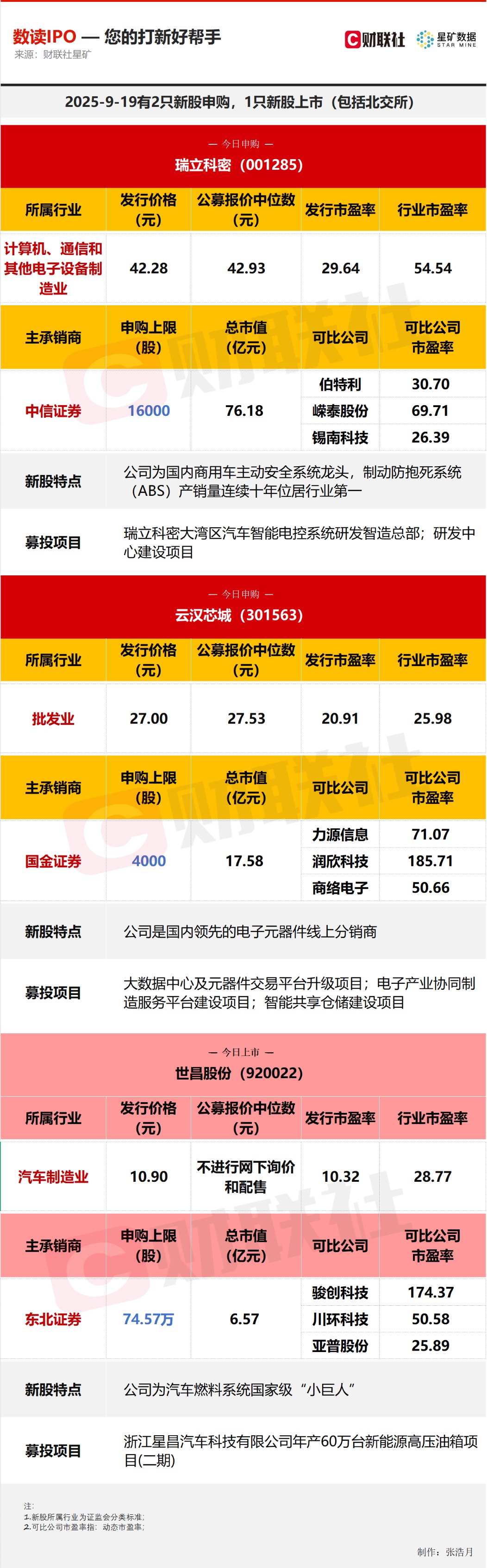 今日有2只新股申购,分别为深交所的瑞立科密、云汉芯城;1只新股上市,为北交所的世昌股份。
