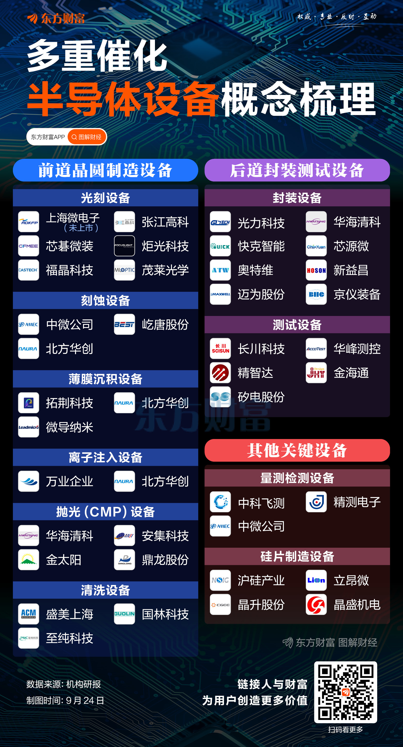 周三半导体概念爆发,设备股领涨,长川科技20cm两连板,微导纳米涨超15%,盛美上海、京仪装备、华海清科、矽电股份等多股涨超12%,中科飞测、芯源微等涨超10%,张江高科10CM两连板,北方华创、立昂微等多股涨停。