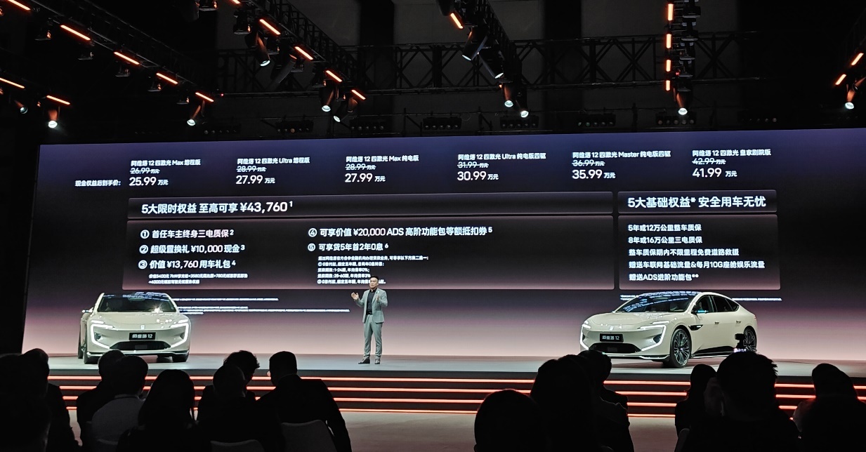 设计方面,阿维塔12四激光版全新推出“曦金灰”外观色,灵感源自破晓晨光,加上同级独享的智能电动升降尾翼与全系可选的电子外后视镜,更添科技锋芒。
