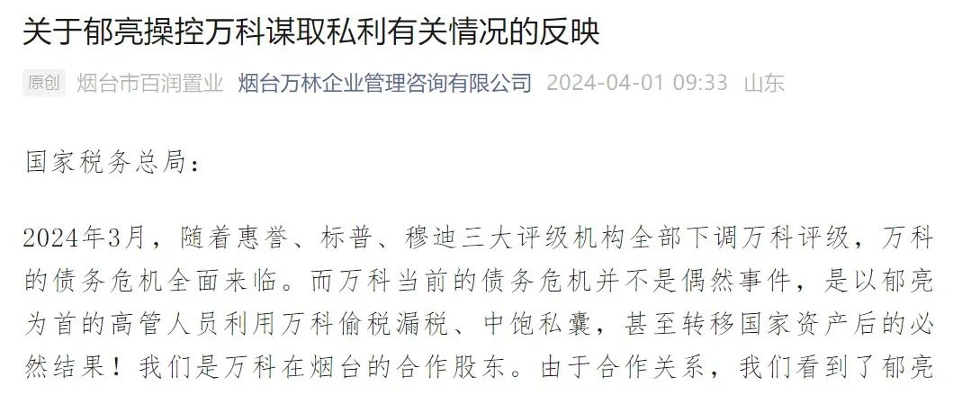 4月1日,此前多次在网络发布针对万科举报信的烟台市百润置业有限公司(以下简称烟台百润),再次在“烟台万林企业管理咨询有限公司”微信公众号发布题为《关于郁亮操控万科谋取私利有关情况的反映》的文章称,万科涉嫌非法设立类金融机构发放高利贷、欺瞒股东挪用项目建设资金等问题。