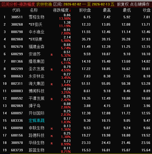 个股方面,96家农业股票中22家收涨,雪榕生物、*ST佳沃以13.98%、11.19%的涨幅领衔;海利生物、康农种业则以26.04%、21.04%的幅度下跌,荃银高科、秋乐种业、农发种业、神农种业等12只农业股跌幅超过10%。